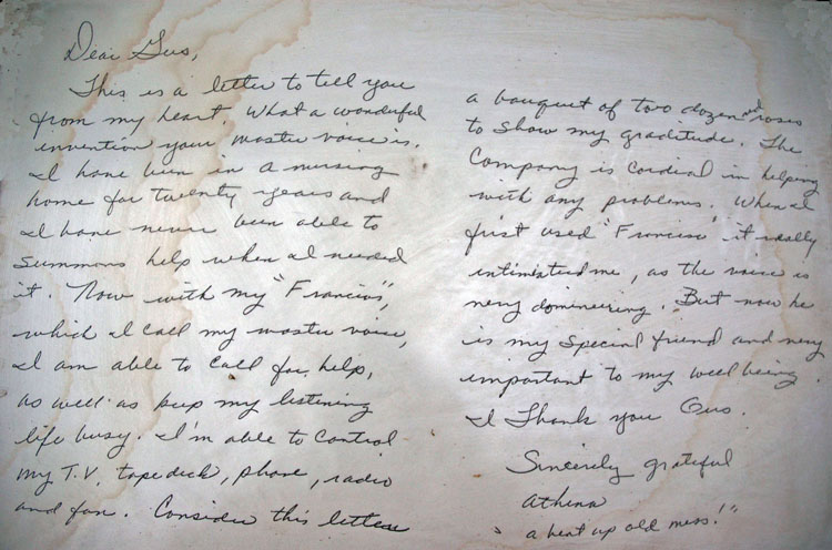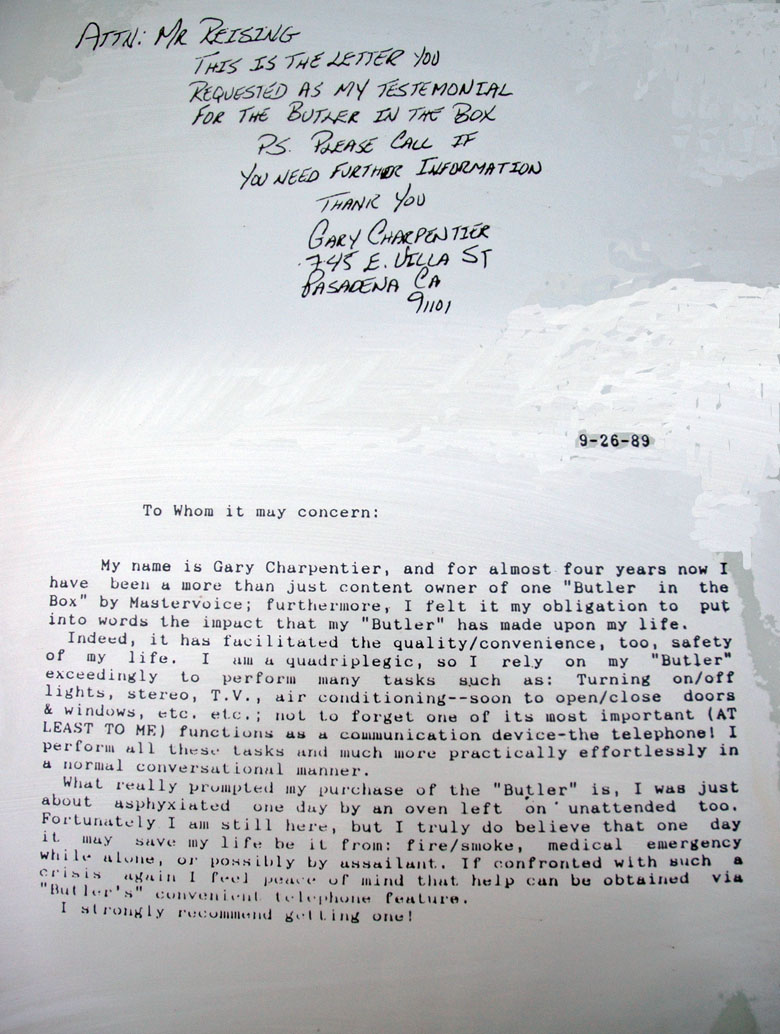 The first human interactive machine in the world. It could see, hear, think, speak, had a personality definable by its owner, was quadlingual, could understand up to four languages simultaneously, and speak any language on earth in 15 seconds. Best of all it just plugged into the wall of a normal house. It operated in four methods of operation, time, touch, situation and voice. It knew day of the week, month of the year, seasons, holidays and even if-then conditions. For example: turn the lights off at 10:00 p.m. but not if we are having a party. It knew that if it was raining not to water the lawn. And of course, you could talk to it by voice.